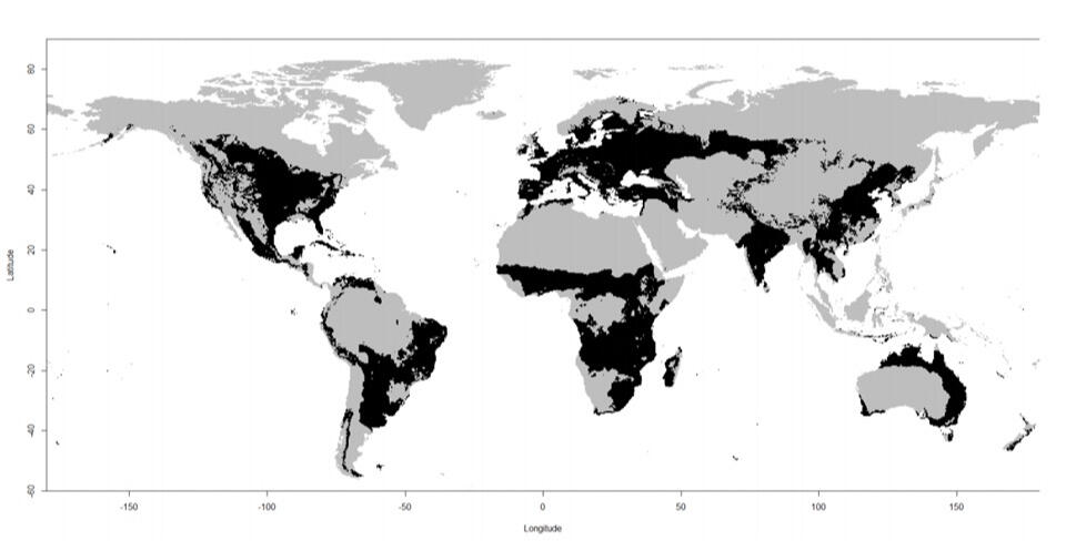 This map shows alternative states in black - the areas which could be forest or open ecosystems, and are often mosaics of the two: